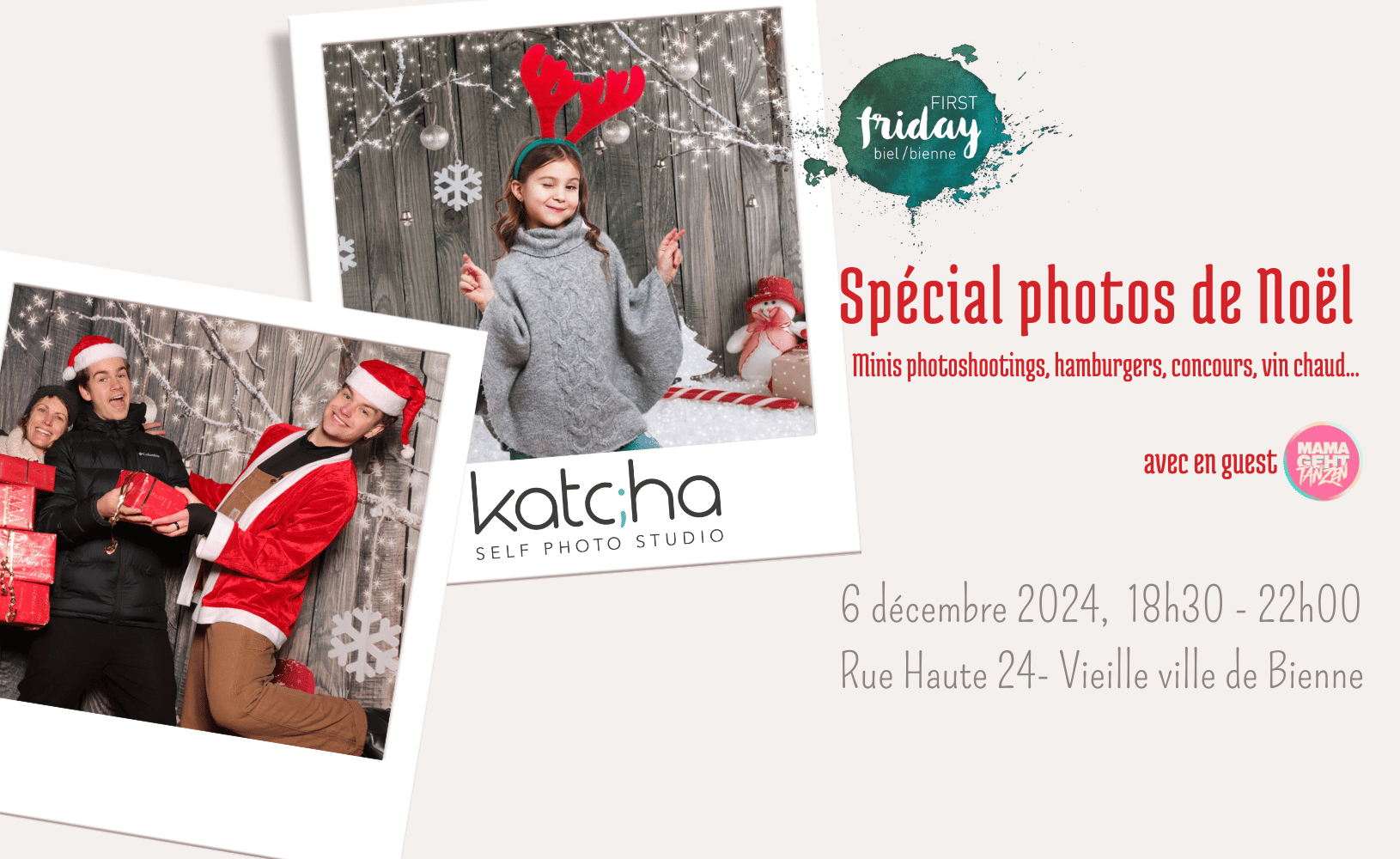 Le studio prendra des airs de Noël avec une déco appropriée et des déguisements de Noël. Tout un chacun pourra venir faire sa photo et peut-être gouter aux délicieux hamburgers de Caro et Ismaël, recette spéciale d'hiver. Les filles du "Mama Geht Tanzen" seront là pour vous faire gagner des prix à la roulette de la chance!
